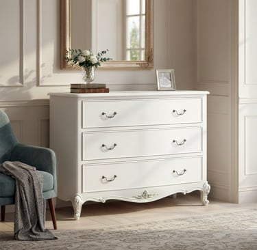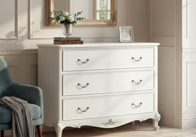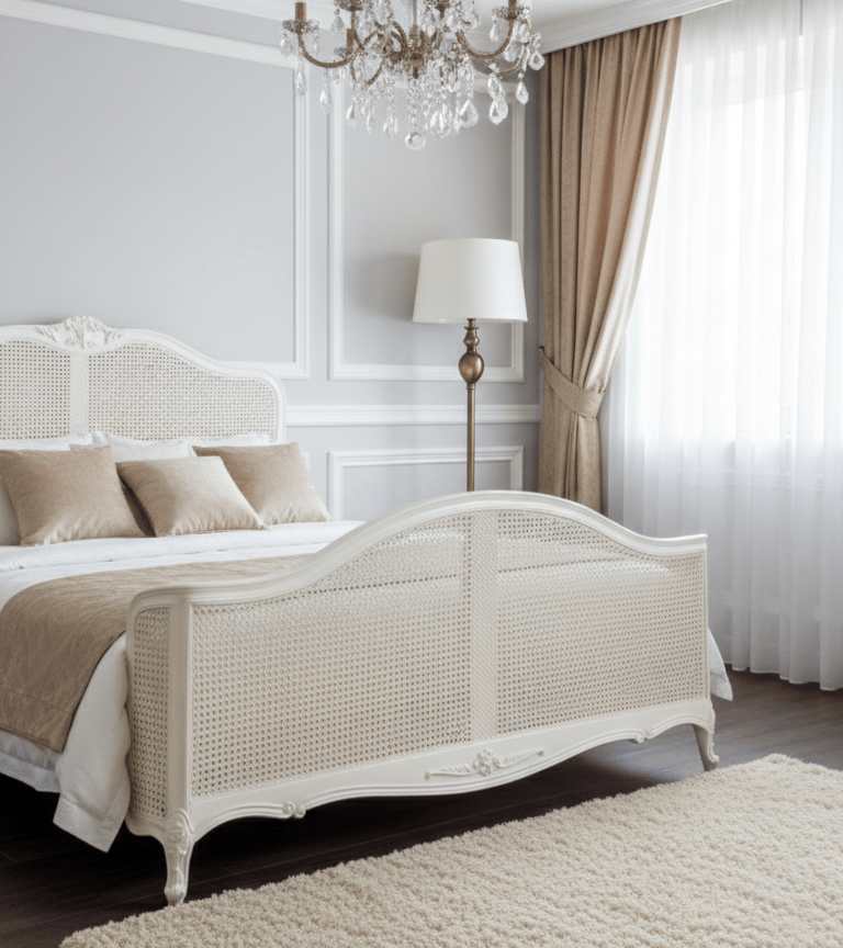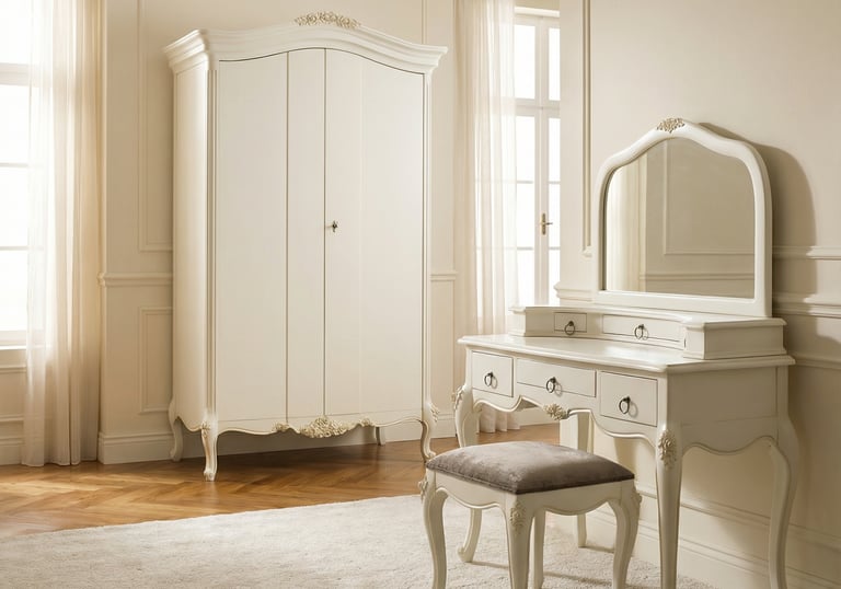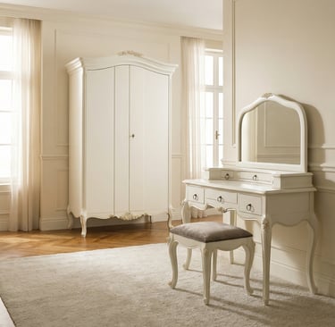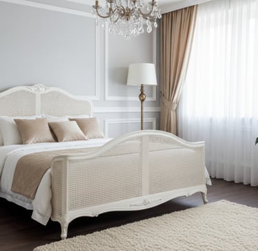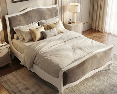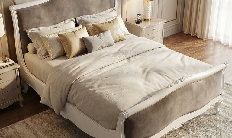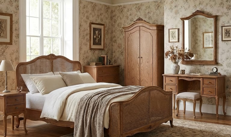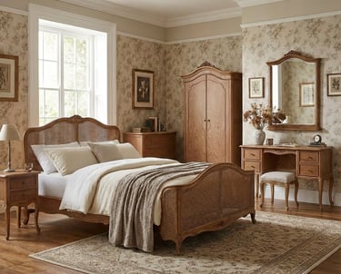 This bedroom set blends warm wood finishes with plush fabric upholstery, creating a welcoming and stylish retreat that invites relaxation after a long day.