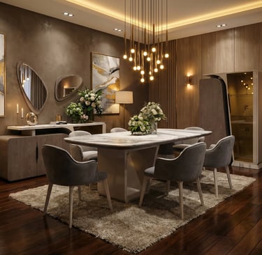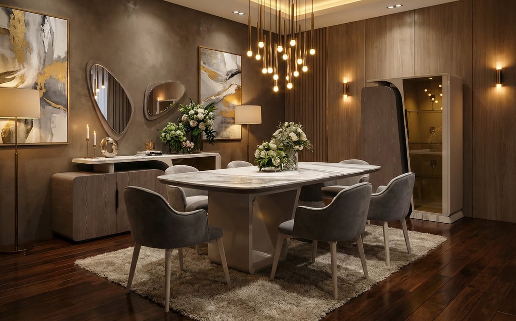 S-24 Dining Room This dining room features clean lines and a gradient of gray tones, accented with subtle gold highlights, creating a sophisticated urban vibe with a modern, elegant feel.