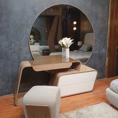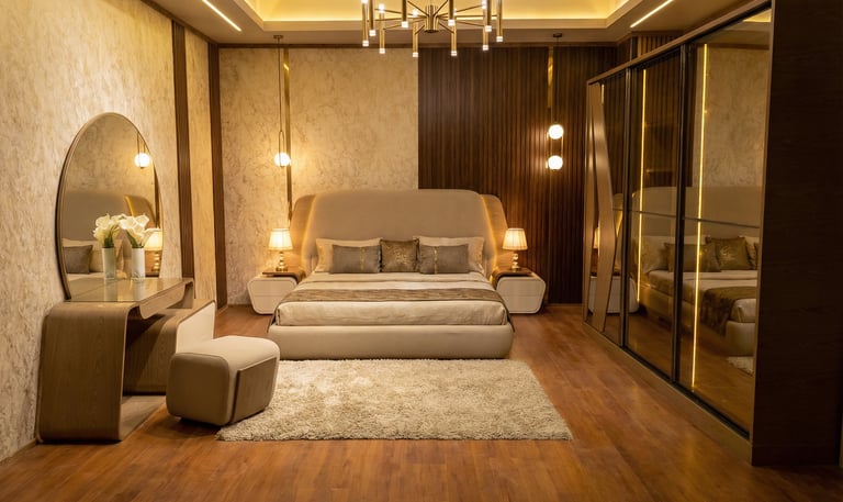 This bedroom set blends warm wood finishes with plush fabric upholstery, creating a welcoming and stylish retreat that invites relaxation after a long day.