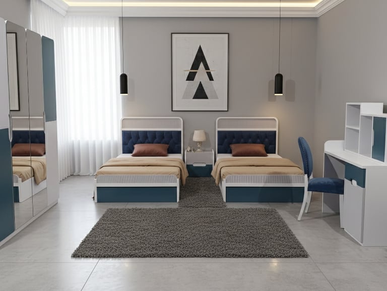 This kids’ room features clean lines and soft beige tones, accented with subtle details, creating a modern, stylish space with a calm and sophisticated urban feel.