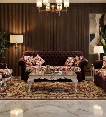 This bedroom set blends warm wood finishes with plush fabric upholstery, creating a welcoming and stylish retreat that invites relaxation after a long day.